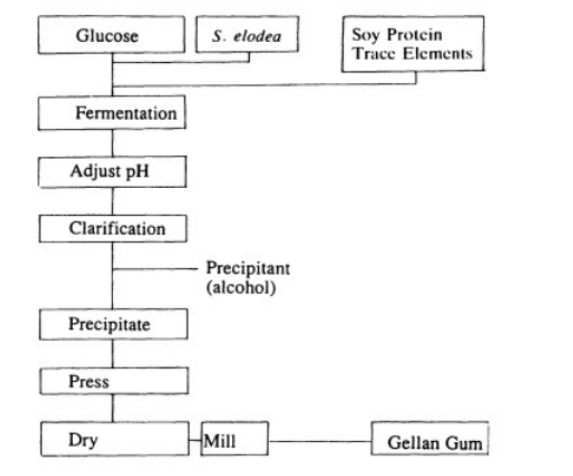 Gellan gum trong nước sốt được sản xuất bằng cách lên men đường với vi khuẩn Sphingomonas elodea thông qua các bước sau: