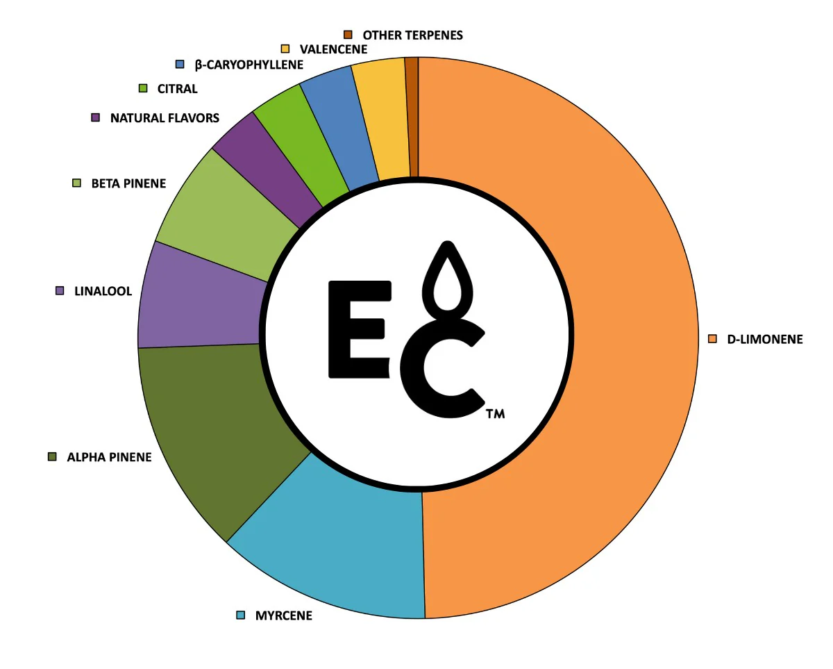 D-limonene là terpene chủ yếu, mang lại mùi cam mạnh và được coi là một dung môi sinh học tự nhiên thay thế cho dung môi hóa học độc hại như toluen hoặc acetone.